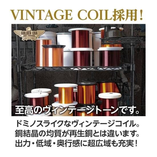 トールDポールピース使用最末期の中でもパワフルでありながら、絶妙のハーフトーンが魅力な'56年型の詳細を分析、解明した綿密な計算と膨大な資料の照合により直流着磁機でヴィンテージパワーを、大きく粗いポールピース加工でヴィンテージトーンを、さらに50年代N極トップ復刻、ワインド前のボビン切削により、経年変化後のコイル形状にすることで高感度・豊かな倍音をさらにルーズなワインディング等を施し、「聴こえが良いのに痛くない」トーンを得る事に成功、ノイズも激減しています。